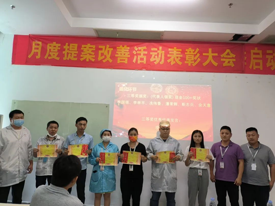 5月份,華南工廠共收到165項有效提案,實際參與提案改善人數174人。經總經辦評審小組審核,最終評出一等獎1名,二等獎3名,三等獎6名,華南工廠領導為優秀提案改善項目及人員頒發榮譽證書、獎金并合影留念。